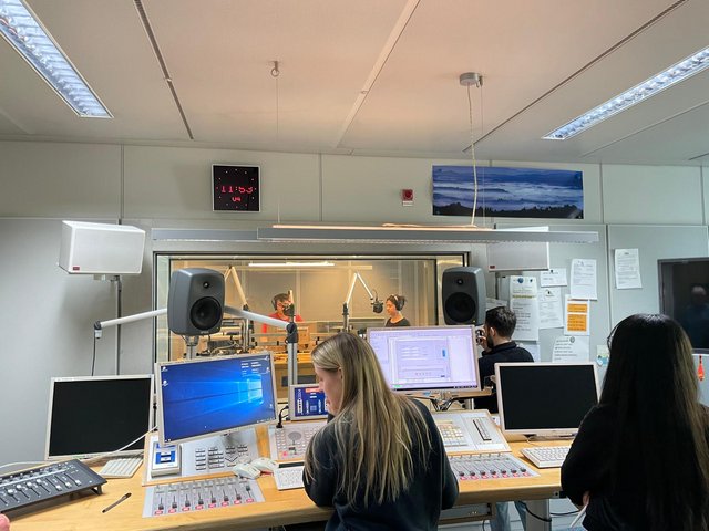 Ein besonderes Highlight war die Teilnahme an einer Live-Radionachrichtensendung im Studio. Aus nächster Nähe erlebten die Schülerinnen und Schüler, wie präzise Abläufe, klare Rollenverteilungen und minutengenaues Timing zusammenspielen, damit eine Sendung pünktlich und fehlerfrei ausgestrahlt werden kann.