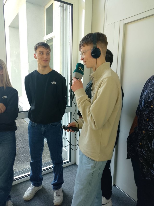 Im zweiten Teil des Workshops wechselte die Perspektive: Die Klasse produzierte eine eigene Radio-Nachrichtensendung. Zunächst erarbeiteten die Schülerinnen und Schüler verschiedene Kurzbeiträge und führten eine Umfrage durch, um authentische O-Töne in ihre Sendung zu integrieren. Anschließend ging es ins Studio, wo Moderation, Sprecherrollen und Technik zusammenkamen. Unter Anleitung des SWR-Teams entstand eine komplette Hörsendung – von der Aufnahme über das Kürzen der Beiträge bis zum finalen Zusammenspiel aller Elemente.