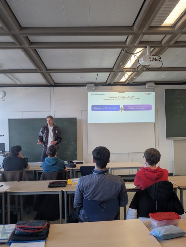 In seinem Vortrag stellte Yann den Schülerinnen und Schülern die verschiedenen Möglichkeiten von Freiwilligendiensten vor. Er erklärte, in welchen Bereichen ein Einsatz möglich ist – zum Beispiel im sozialen Bereich, in Kultur, Sport, Umwelt oder Verwaltung – und welche Aufgaben und Inhalte ein Freiwilligendienst mit sich bringt. Dabei ging es auch um den Alltag im FSJ, um Seminare und um die Chancen, eigene Interessen auszuprobieren und neue Perspektiven für die berufliche Zukunft zu gewinnen.